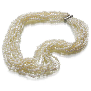 Orchira's stunning 10 strand white cultured pearl necklace Irresistible Ivory, hand strung with over 1000 baroque shape pearls and finished with rhodium plated 925 sterling silver tube clasp. Can be worn loose or twisted, creating different looks and length, twisted is around 45cm long and loose is 3cm longer. Ideal for any formal day wear, bridal dress or evening wear.